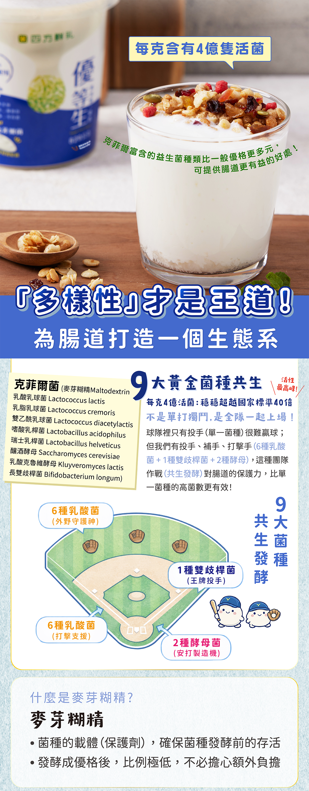 (麥芽糊精Maltodextrin、乳酸乳球菌 Lactococcus lactis、乳脂乳球菌 Lactococcus cremoris、雙乙酰乳球菌 Lactococcus diacetylactis、嗜酸乳桿菌 Lactobacillus acidophilus、釀酒酵母 Saccharomyces cerevisiae、乳酸克魯維酵母 Kluyveromyces lactis、瑞士乳桿菌 Lactobacillus helveticus、長雙歧桿菌 Bifidobacterium longum)