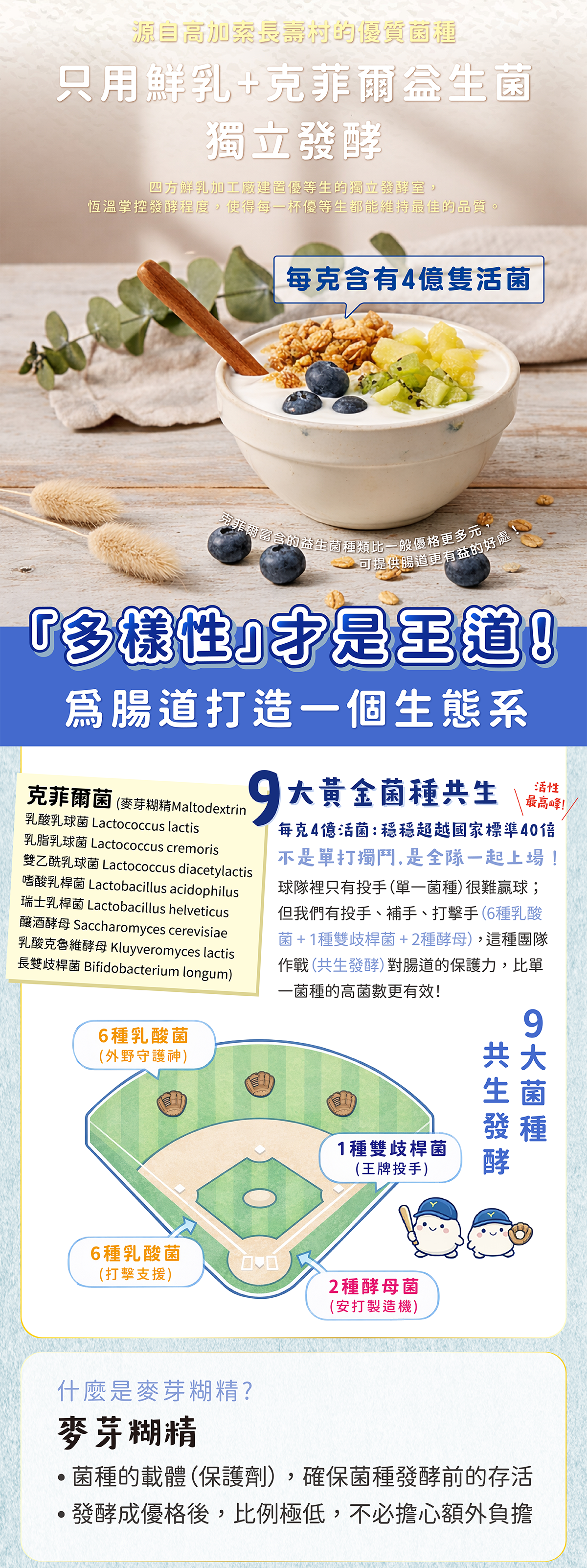 (麥芽糊精Maltodextrin、乳酸乳球菌 Lactococcus lactis、乳脂乳球菌 Lactococcus cremoris、雙乙酰乳球菌 Lactococcus diacetylactis、嗜酸乳桿菌 Lactobacillus acidophilus、釀酒酵母 Saccharomyces cerevisiae、乳酸克魯維酵母 Kluyveromyces lactis、瑞士乳桿菌 Lactobacillus helveticus、長雙歧桿菌 Bifidobacterium longum)