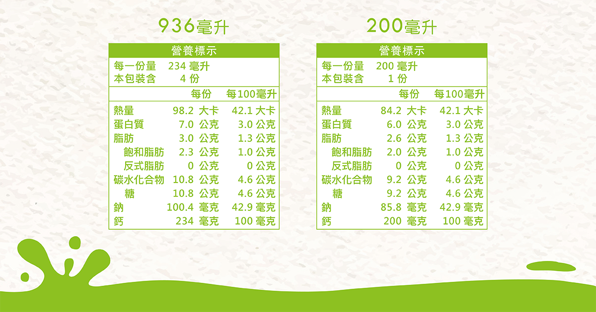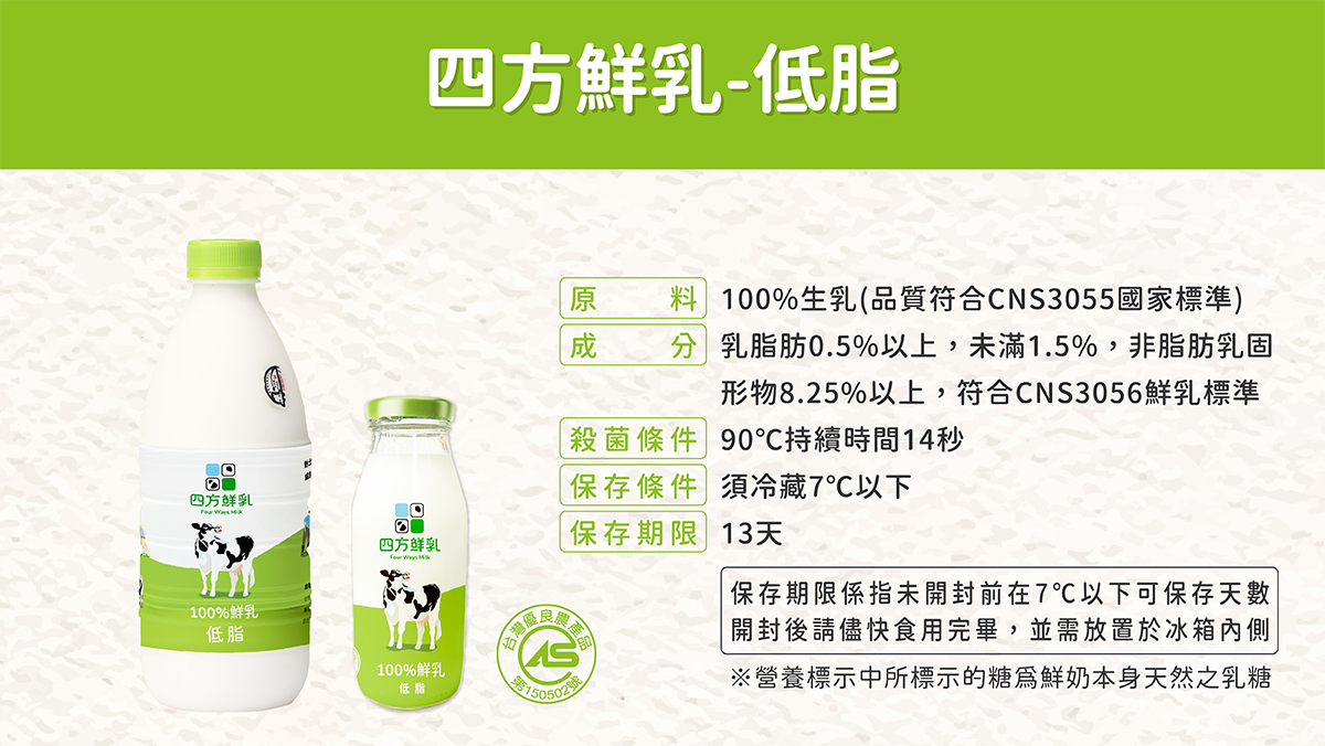 成分:乳脂肪0.5%以上,1.5%以下,非脂固形物8.25%以上(符合CNS3056鮮乳標準)